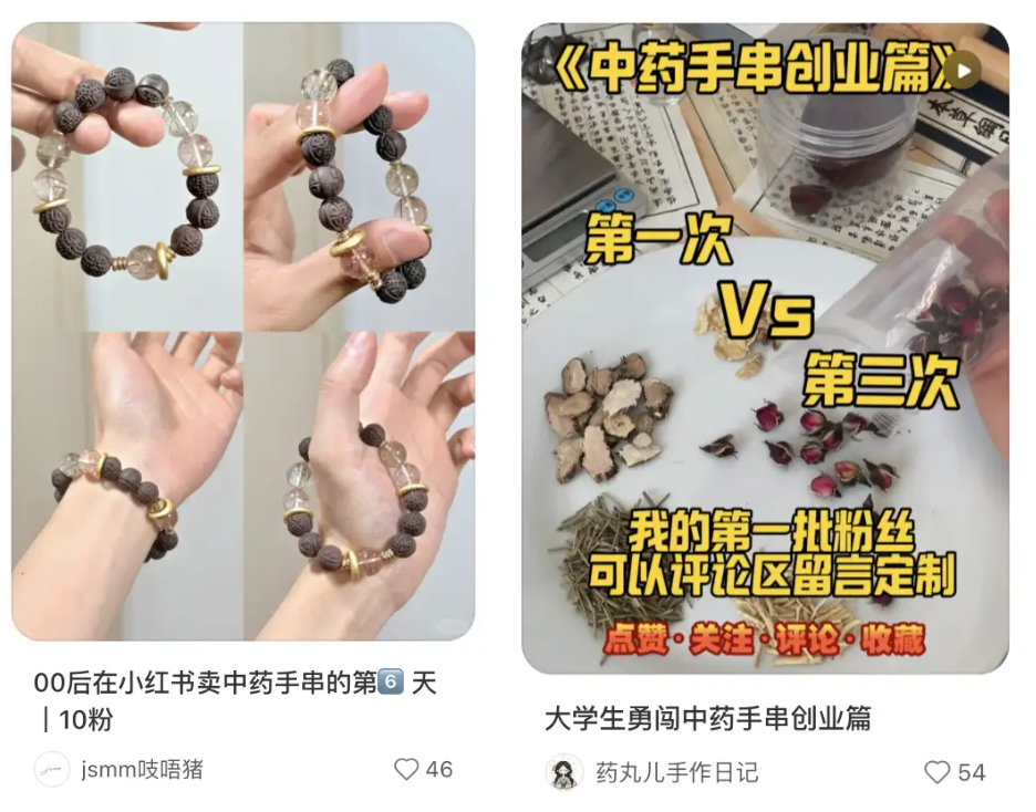 或者,乾脆也加入其中,自制中藥手串。社交媒體上,不少00後、大學生都開始嘗試中藥手串創業。