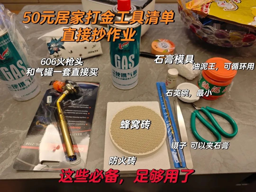 熔金噴槍、壓花模具……打金套裝只需50元,成本真的不高。而且這些工具基本都是可循環用的,工費能立省大幾千不説,還能想要多少做多少。