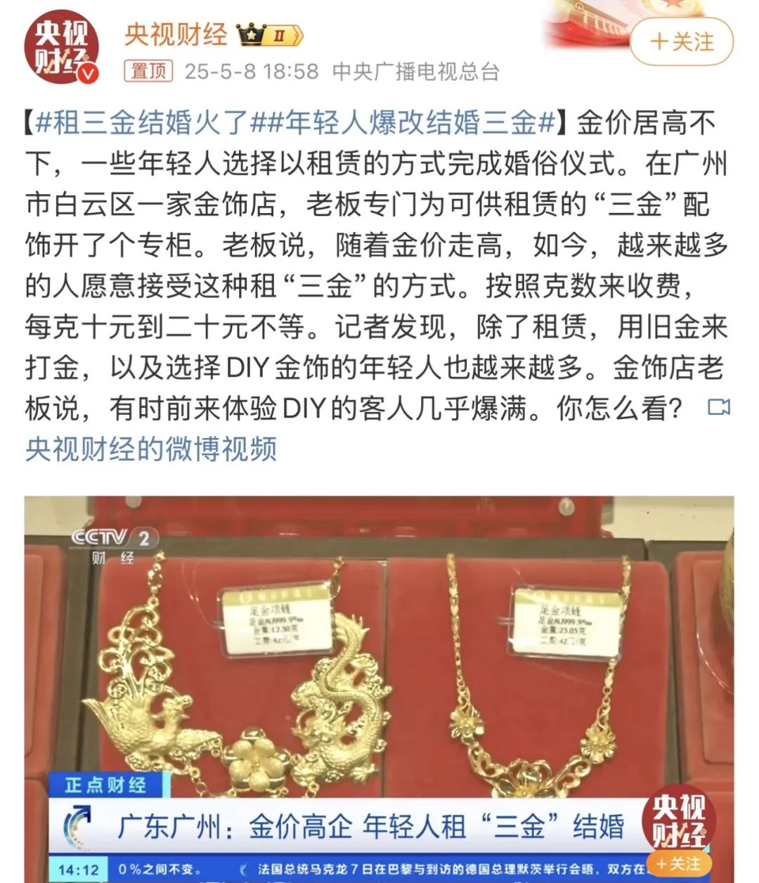 但金價的變化,也影響到了不少年輕人的生活。最近,年輕人流行起了租三金結婚。