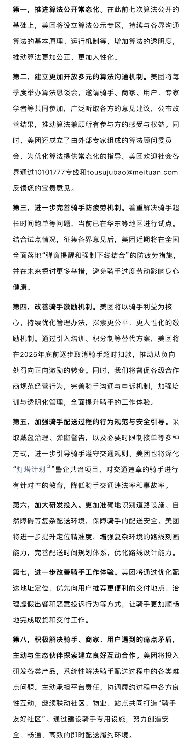 緊接着12月份,公佈了保障騎手權益八項改進舉措,包括進一步完善騎手防疲勞機制、改善騎手激勵機制、加強騎手配送過程的行為規範與安全引導、進一步改善騎手工作體驗等。