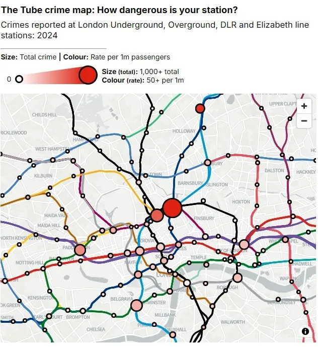 根據2024年數據,《每日郵報》總結了一份倫敦地鐵站的犯罪率排名,國王十字、尤斯頓、帕丁頓、倫敦橋……都屬於重災區,