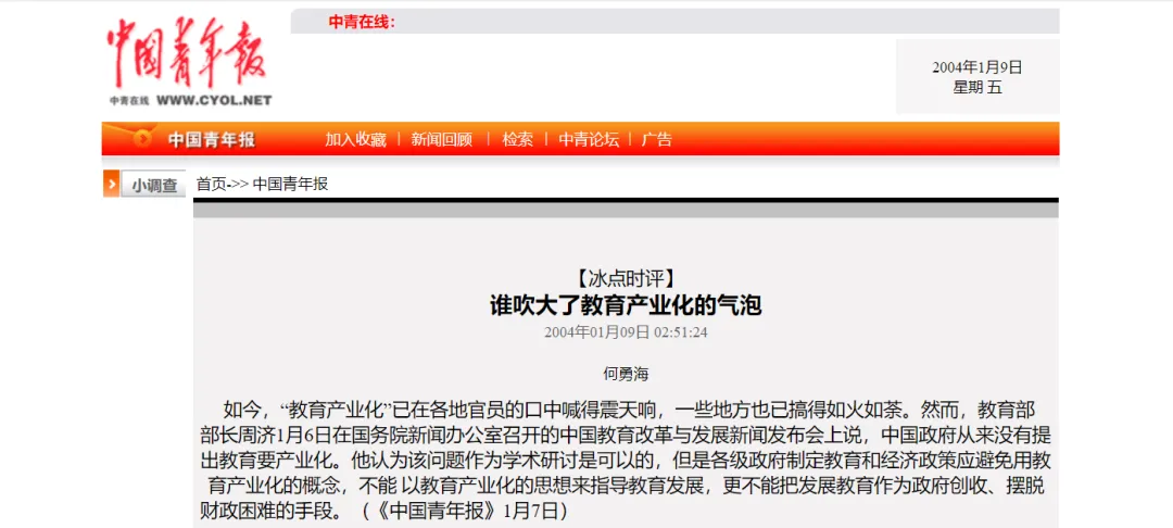 中國青年報2004年關於教育產業化的報導