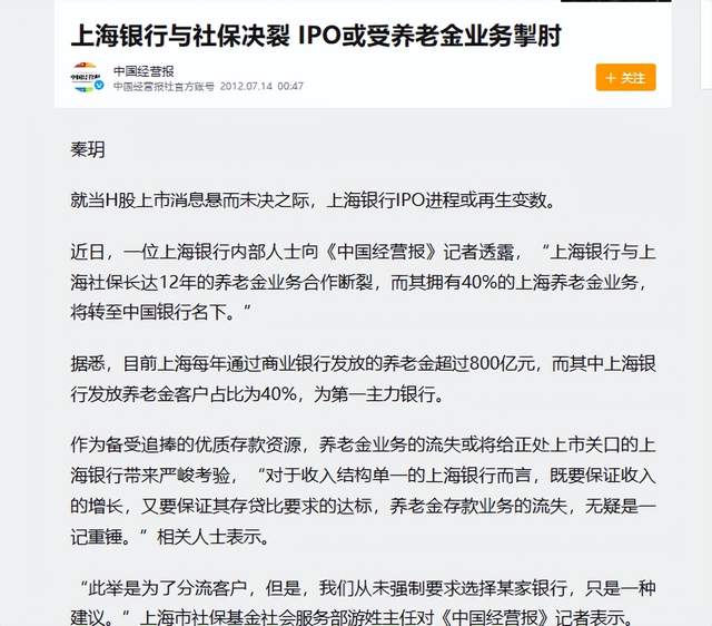 早在2012年,中國經營報就曾報道稱,上海銀行與上海社保長達12年的合作斷裂,上海銀行名下全部養老金業務將轉移至中國銀行。儘管該消息此後被證偽,但在當時市場仍掀起軒然大波。