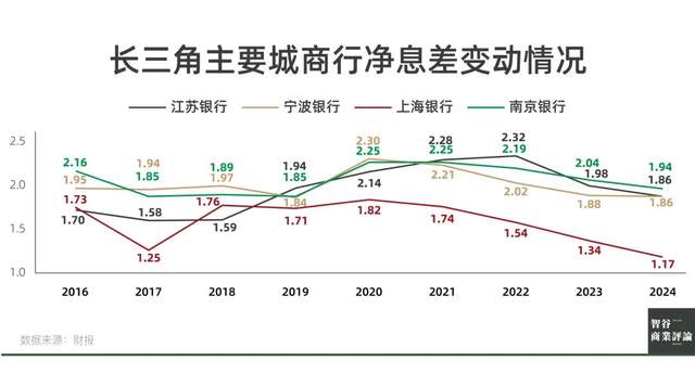 數字反映的問題,至少説明上海銀行對公業務的賺錢能力尚在。但與這條一路走高的利潤率曲線形成鮮明對比的,是一路走低的淨息差。2018年後,上海銀行的淨息差在長三角主要競爭對手中一路墊底。