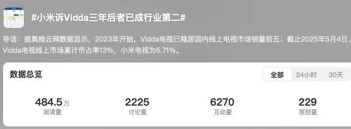 自然,不忘自誇一下後,Vidaa在過去三年取得了驚人的成就的話題就衝上了熱搜。就比如今天的另一條熱搜——小米訴Viadda三年後者已成行業第二。