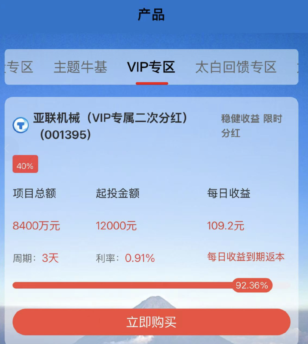 據另一位受害者提供的APP截圖顯示,達到VIP1需累計建倉3萬元,VIP2需10萬元,最高等級V9需累計建倉1200萬。部分投資項目的日利率接近1%,投資12000元,一天就能有109元的收益,以此計算,不到3個月時間便可以實現翻倍。還有受害者透露:“騙子曾揚言投資100萬,4個月變成了400萬,收益直接翻4倍。”