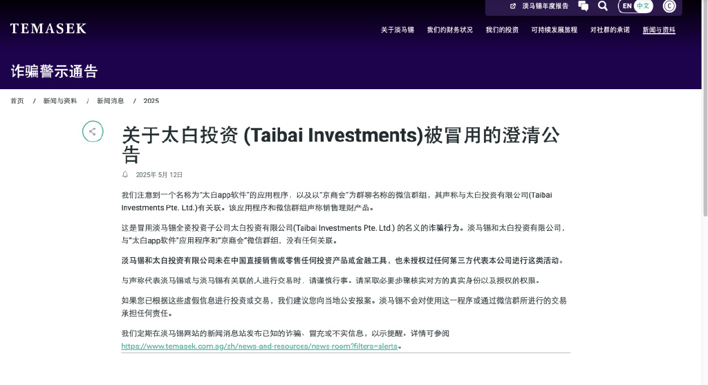 自1974年成立以來,淡馬錫以新元計算的複合年化股東總回報率為14%。今日,淡馬錫官方發佈《關於太白投資 (Taibai Investments)被冒用的澄清公告》,官方表示,這是冒用淡馬錫全資投資子公司太白投資有限公司(Taibai Investments Pte. Ltd.) 的名義的詐騙行為。淡馬錫和太白投資有限公司,與“太白app軟件”應用程序和“京商會”微信羣組,沒有任何關聯。淡馬錫強調,淡馬錫和太白投資有限公司未在中國直接銷售或零售任何投資產品或金融工具,也未授權過任何第三方代表本公司進行這類活動。