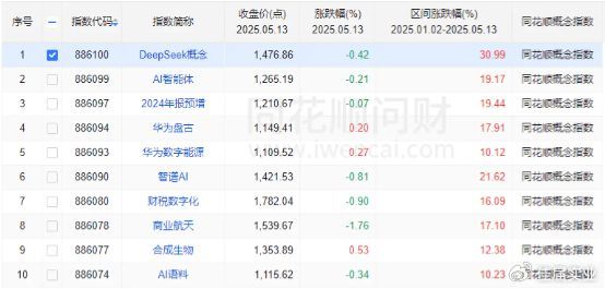 年初至今(截至5月13日),同花順概念指數漲幅前10中超過一半與AI相關,其中DeepSeek概念(886100)累計漲幅31%,冠絕兩市。