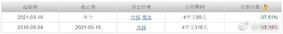 知名基金經理曲揚單獨管理了4年又316天,期間任職回報93.3%。2021年3月16日至今,由曲揚、魏淳共同管理,期間任職回報陡降至-37.51%。