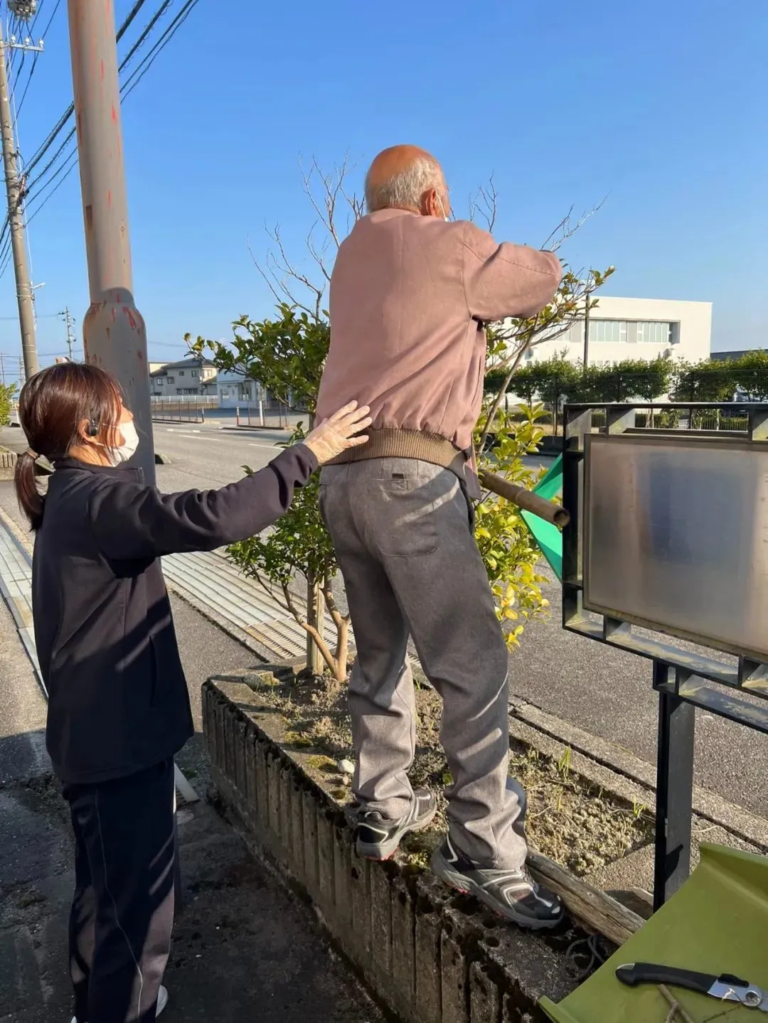 在護理人員的陪伴下,這名老人自行修剪樹籬。(圖/Facebook@社會福祉法人喜壽會)
