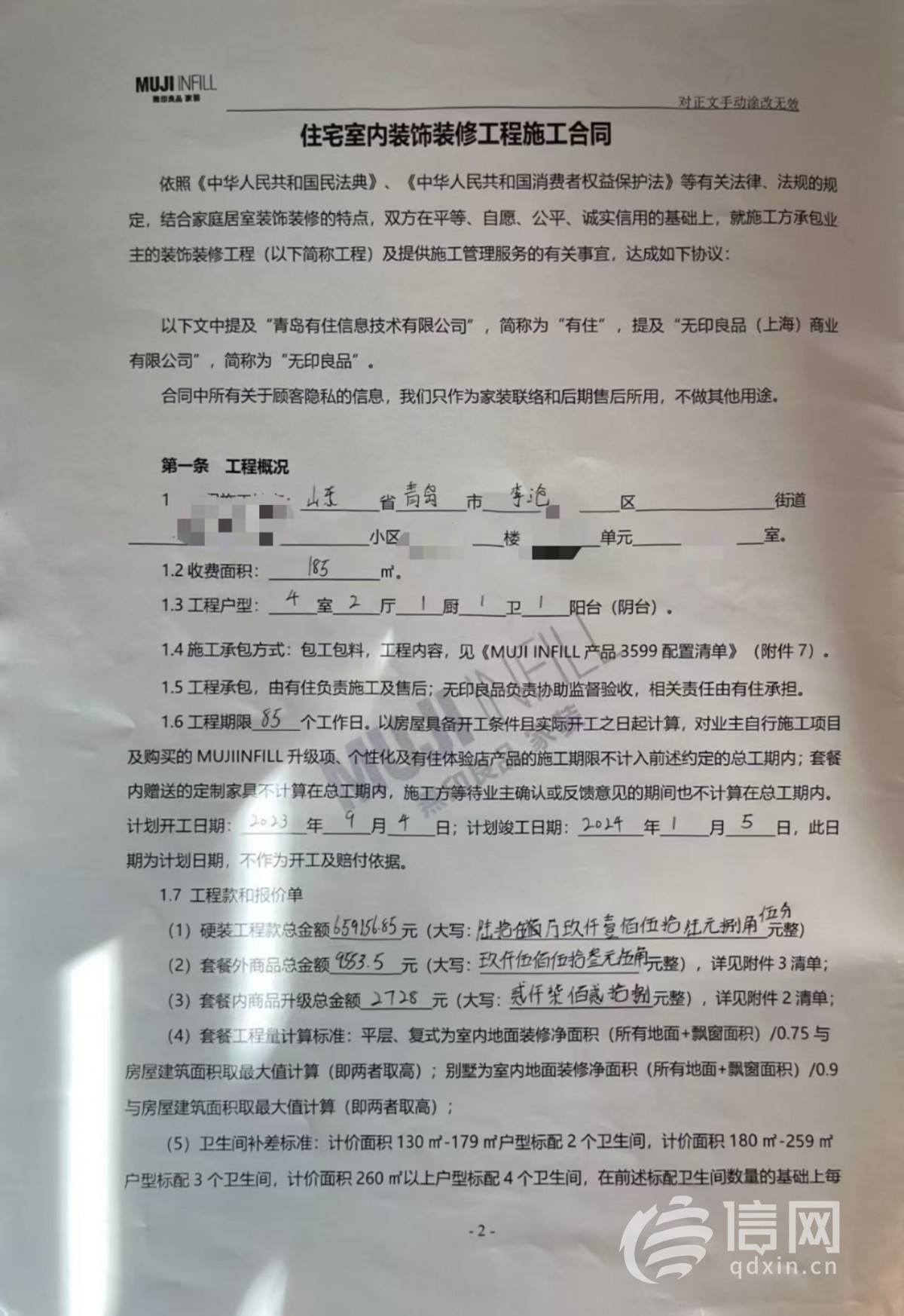 雙方簽訂的裝修合同。(來源:受訪者)信網5月14日訊 無印良品的“極簡風”受到不少年輕消費者的推崇,在裝修自己的新家時,王先生就選擇了無印良品的家裝服務,簽了一份近70萬的裝修合同,也拿到了無印良品109頁的施工品質標準。可搬進新家後,王先生對照標準,發現了23處不符之處,包括衞生間幹區防水高度不夠、屋內開關高度不一致等問題,“説不上是大毛病,但林林總總的瑕疵不少。我選無印良品裝修衝的就是品質,沒想到會有這樣的問題。”如今,無印良品的家裝業務線下展廳已經撤除,王先生無法順利對接到品牌工作人員來處理這些小毛病,成了另一件煩心事。