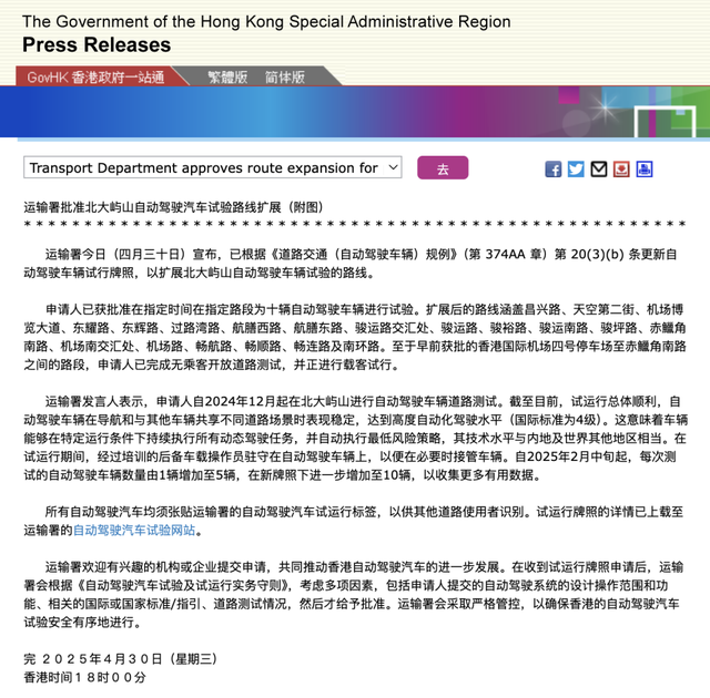 4月30日,香港特別行政區運輸署發佈消息稱,已根據《道路交通(自動駕駛車輛)規例》更新自動駕駛車輛試行牌照並擴大蘿蔔快跑無人駕駛車輛在香港的測試區域,同時測試的車輛由5輛增加至10輛,蘿蔔快跑成為唯一一家在港獲得實質性進展的無人駕駛企業。