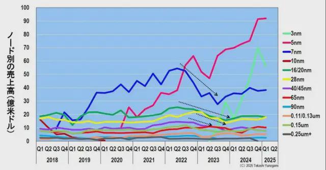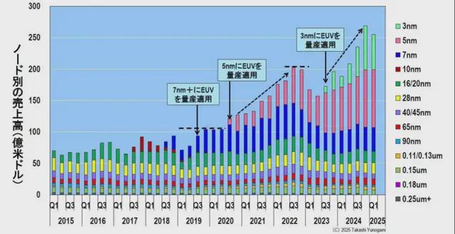 此後,由於對新冠疫情的特殊需求結束導致經濟衰退,整體銷售額暫時下降,但在 2023 年第二季度觸底並再次開始上升。 同年第三季度,3nm 節點的銷售額創下紀錄,5nm 和 3nm 推動了增長,2024 年第四季度超過 250 億美元。