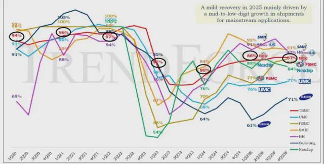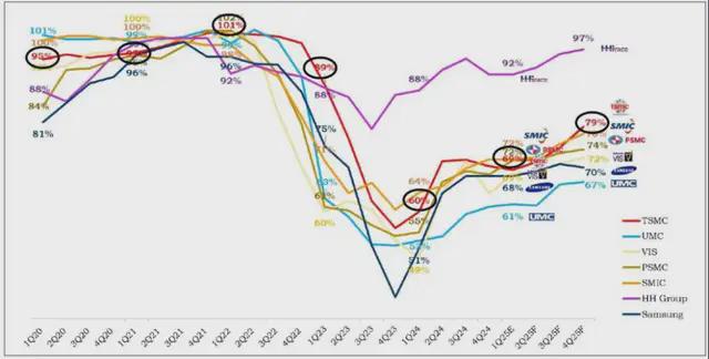 對於 8 英寸代工廠(中國的 HH Grace 除外),銷售額下降到 50% 左右,對於 12 英寸代工廠,銷售額下降到 60% 左右。 即使在 2025 年第四季度,預計它們都無法達到滿負荷運轉。