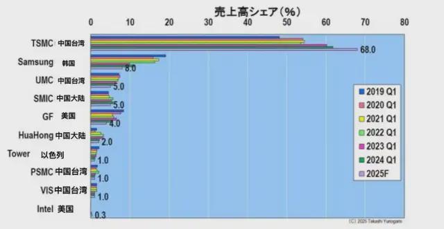 此外,從主要代工廠的銷售份額來看,只有台積電自 2019 年第一季度以來的市場份額持續增長,預計到 2025 年將佔據 68% 的市場份額(圖 2)。 另一方面,排名第二的三星電子曾設定了在 2030 年超越台積電的目標,預計份額將從 2019 年第一季度的 19% 下降到 2025 年的 8%,因此能否獲得第二名是個疑問。