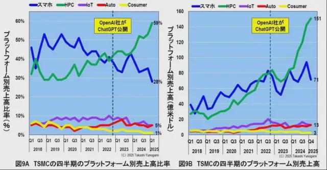 然而,在 OpenAI 於 2022 年 11 月 30 日發佈 ChatGPT 後,情況發生了變化。 智能手機的比率在反覆起伏的同時逐漸下降,到 2025 年第一季度降至 28%。 另一方面,包括 NVIDIA GPU 等 AI 半導體在內的 HPC(高性能計算)比率一直在穩步增加,在 2025 年第一季度達到 59% 的歷史新高。 另一方面,汽車、物聯網和消費產品的銷售額都不到 5%。