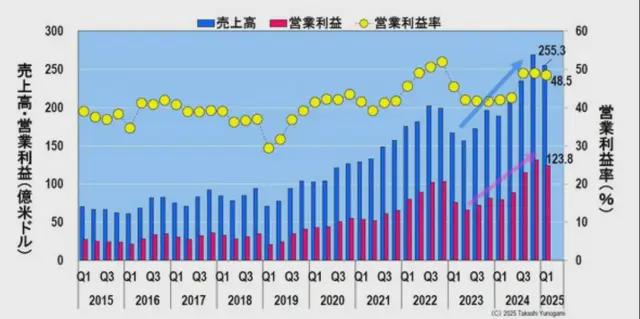 根據台積電 4 月 17 日公佈的 2025 年第一季度 (Q1) 財務業績,銷售額同比增長 41.6% 至 255.3 億美元,營業利潤同比增長 56.1% 至 123.8 億美元,均創下第一季度(1~3 月)的歷史新高。