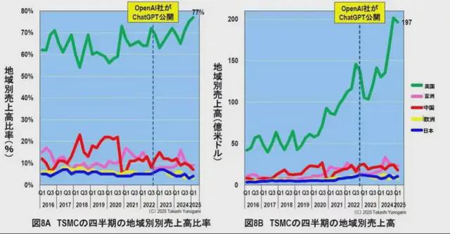 圖 8顯示了 TSMC 按地區劃分的銷售額(比率)。 首先,從各地區的銷售額比率來看,從 2016 年到 2024 年,與美國的比率一般為 60~70%(圖 8A)。 然而,在 2025 年第一季度,對美國的出口達到了創紀錄的 77%。 世界其他地區,即亞洲、中國、日本和歐洲,都不到 10%。