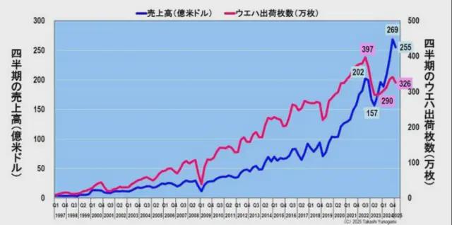 圖 3 顯示了季度銷售額和硅片出貨量。 2022 年第三季度疫情爆發時,其季度收入為 202 億美元,但由於疫情結束帶來的經濟衰退,2023 年第二季度降至 157 億美元。 此後,銷售額穩步恢復,輕鬆超過了 2022 年第三季度的峯值,並在 2024 年第四季度達到創紀錄的 269 億美元。 它在 2025 年第一季度略微下降至 255 億美元,但可能會在 2025 年第二季度之後再次創下歷史新高。