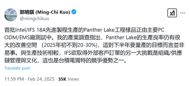 英特爾在良率數據披露上較為模糊,雖有副總裁表示Intel 4 製程良率高於預期,Intel 3 製程達成整體良率和性能目標,但天風國際分析師郭明錤曾稱,2025 年初首批 Intel/IFS 18A 先進製程生產的 Panther Lake 工程樣品良率不到 20% - 30%。