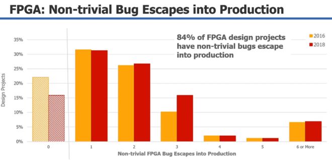 在2018年之前,半導體行業的ASIC首次流片成功率也是維持在30%左右,但2018年直接降到了26%。FPGA的數據比較難統計,但是可以看生產中漏掉的BUG數量。2018年,只有16%的FPGA項目能夠實現零BUG漏出,這其實比ASIC首次流片成功率的下降更加嚴重。