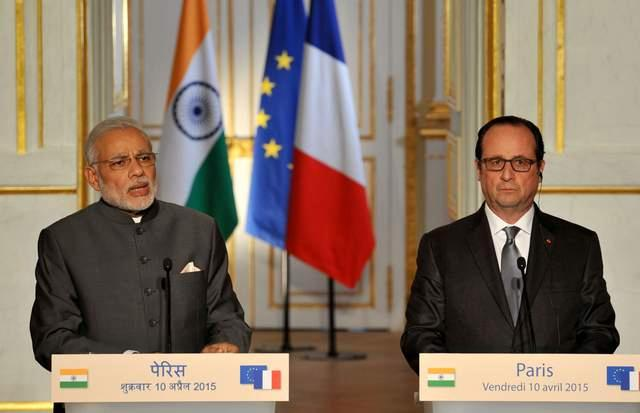 ▲2015年4月10日,新上台的印度總理莫迪(左)與法國總統奧朗德(右)在法國首都巴黎宣佈,印度將採購36架“陣風”