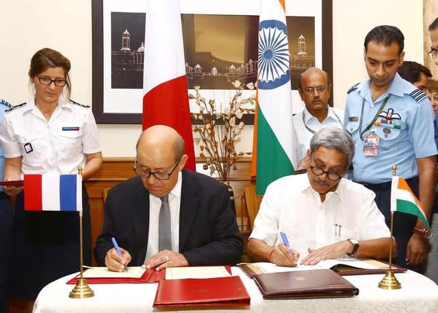 ▲2016年9月23日,印度國防部長馬諾哈爾·帕裏卡(右)和法國國防部長讓·伊夫·勒德里昂(左)在印度首都新德里簽署了關於“陣風’戰鬥機的政府間協議。