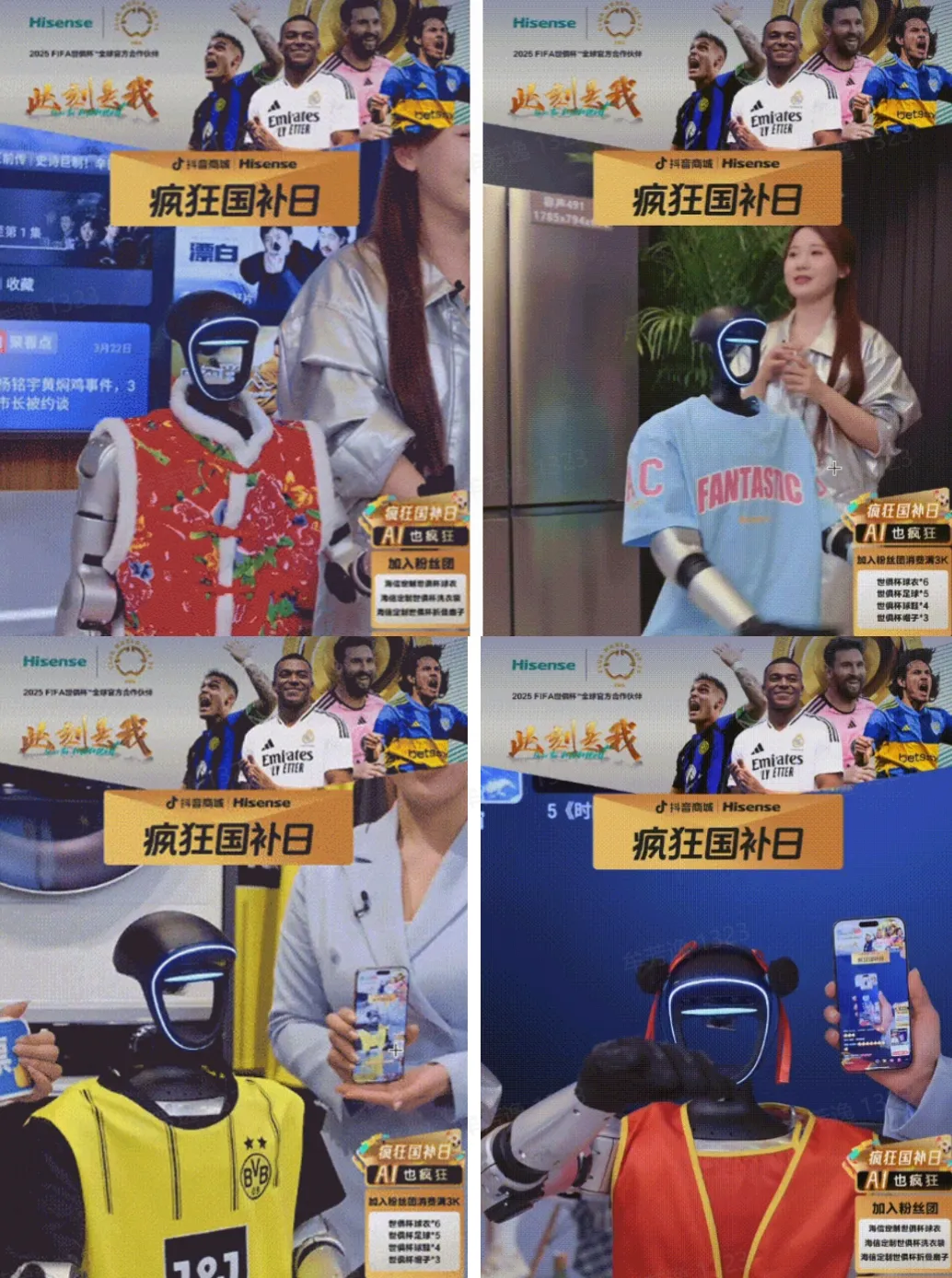 以海信直播間的創新玩法為例,晚會同款“電子顯眼包”宇樹機器人花式秀才藝,換膚走秀、角色模仿秀、APT熱舞輪番上陣,直播間互動率提升20%。在上海AWE展會直播中,通過宇樹機器人與黑悟空的跨界互動,引發大量自來水討論,話題衝上上海同城榜TOP3。整個國補活動期間,國補GMV和國補滲透率均破品牌歷史紀錄。
