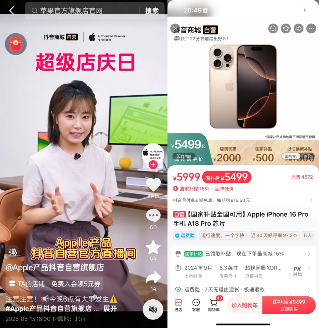 近日,iPhone16 Pro 迎來降價,128G版本可享受國家補貼,到手價5499元起。消費者既可以在抖音商城的核心入口一鍵下單,也可以通過Apple產品遠通旗艦店、Apple授權專營店(小時達) 以及 Apple產品抖音自營旗艦店等多個渠道選購。