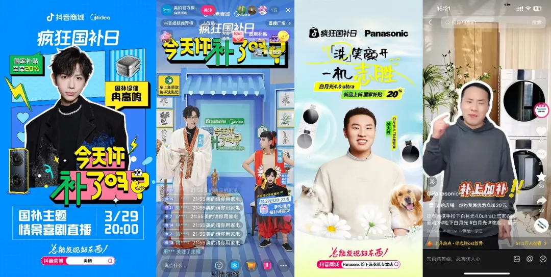 美的店播以“今天你補了嗎”為主題打造情景小劇場,達人冉高鳴化身“國補診仙”,與哪吒、石磯娘娘等“當紅流量”,將國補政策與產品優勢巧妙融入劇情,當日直播場觀就突破90萬,國補GMV爆發64倍。松下直播間則邀請到脱口秀演員徐志勝,以輕脱口秀形式幽默演繹產品賣點及國補福利,互動小遊戲爆笑連連,國補GMV爆發68倍。