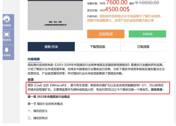 某行業研究報告,目錄裏面赫然寫着“煤炭,收穫來自煤礦石以及擊殺凋零骷髏。”一看這段就是用Ai寫的。要知道這是一份極其正式的報告,售價不菲,就連這樣的東西都是用ai編的,可想而知我們生活中ai編造的假信息已經有多氾濫了。