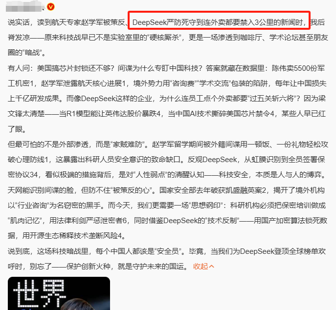 DeepSeek橫空出世、驚豔眾人時,還有人言之鑿鑿誇獎它保密工作做得好,嚴防死守到外賣都要禁入3公里,是科技戰的好榜樣。