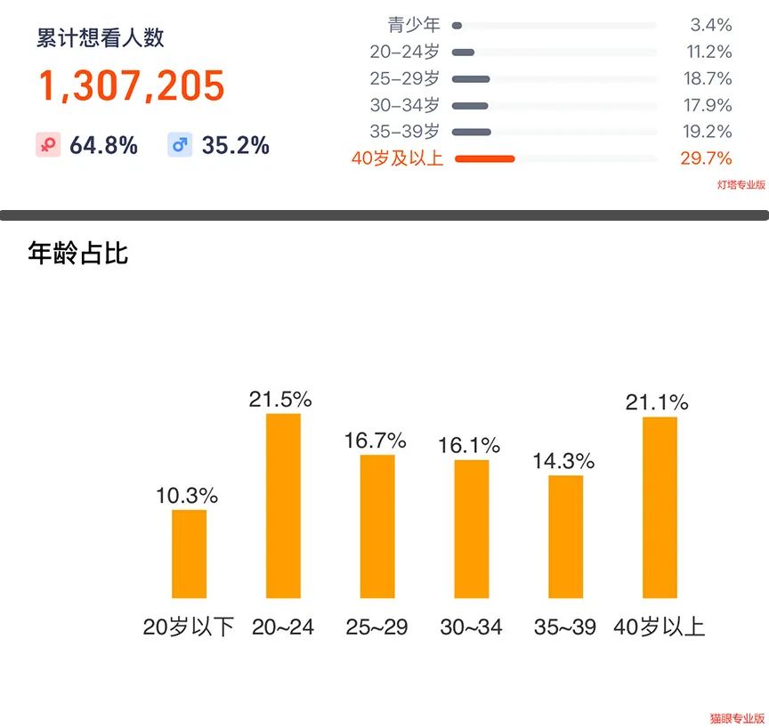 即便在大家引以為傲的《哪吒2》的觀影人羣畫像中,依據燈塔數據庫和貓眼專業版的分析,30-39歲的觀眾佔比均超過了30%,20-24歲的觀眾佔比僅為11.2%(燈塔專業版)和21.5%(貓眼專業版)。