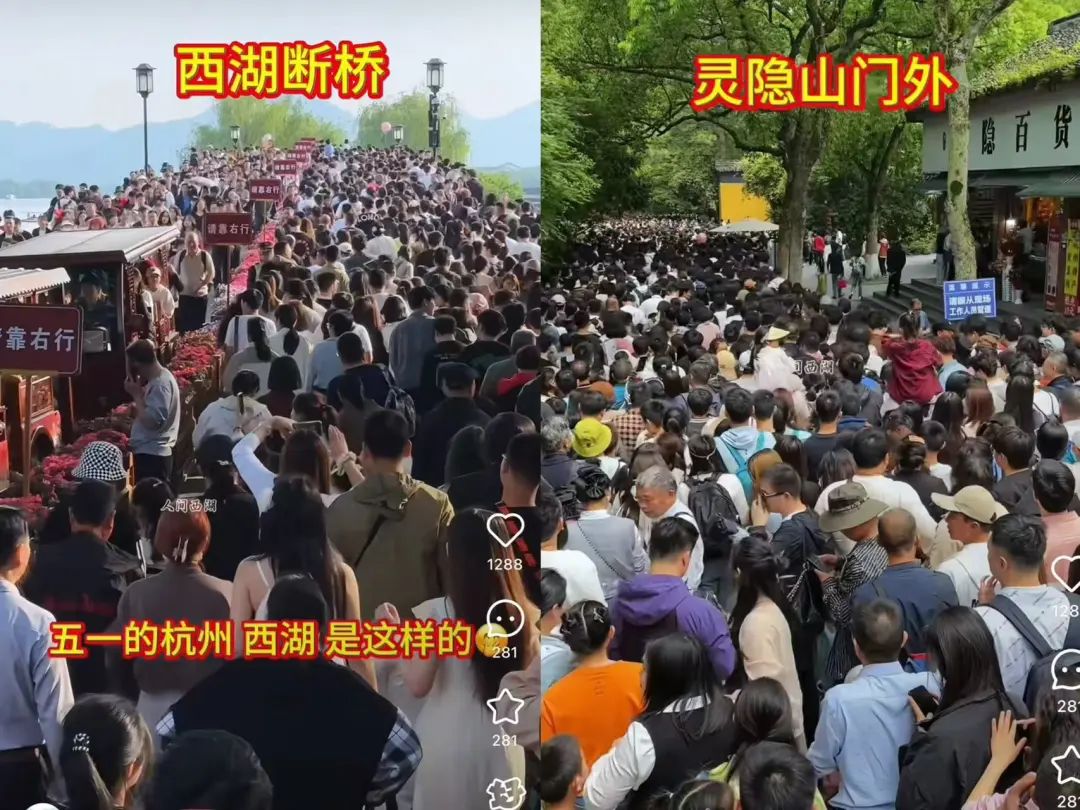 每年的五一小長假,遊客集中的消費場景就是各地景點,尤其是知名景區、景點,更是屢屢破客流高峯紀錄。今年的5月1日當天,上海豫園瞬時峯值2.4萬人,累計客流21萬人次,除了室外的園林景觀摩肩接踵,豫園內各家老字號餐飲店也是人氣爆棚座無虛席。而杭州的靈隱寺景區入口處,一樣的人潮湧動,蜿蜒的隊伍一眼望不到頭。杭州西湖遊客調侃,“斷橋要壓斷了”。