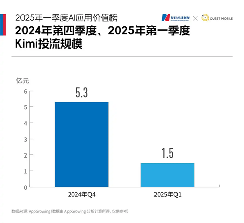 同時,據App Growing統計,Kimi在2025年第一季度的廣告投入已縮減至1.5億元,較去年第四季度的5.3億元驟降72%。對於這一投流剎車舉動,月之暗面內部解釋為受到“外部因素和內部戰略調整影響”。
