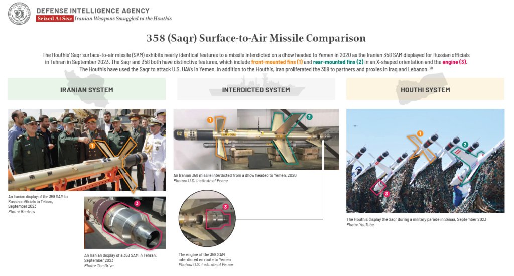 美國國防情報局(DIA)2024年發佈的一份非機密報告中的信息圖討論了“358”/“薩克爾”地對空導彈,其中還提到了該導彈對美軍無人機的使用情況。美國國防情報局