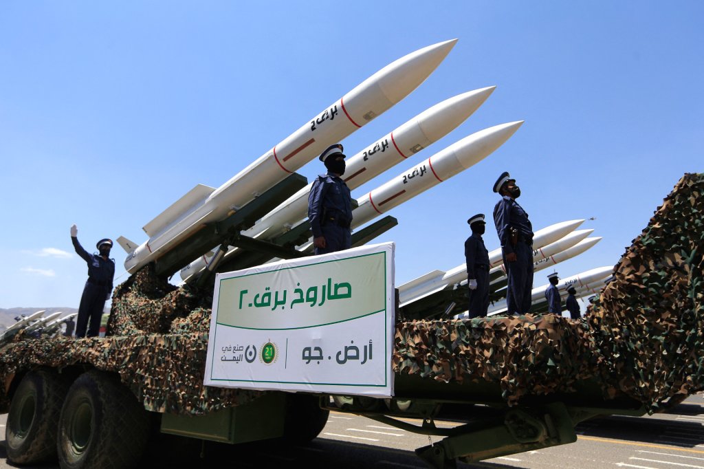 胡塞武裝“巴爾克”系列雷達制導地對空導彈在閲兵式上亮相。穆罕默德·胡韋斯/法新社通過蓋蒂圖片社