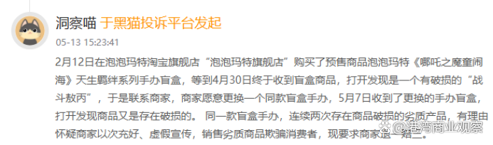 一位消費者5月13日投訴稱,“2月12日在泡泡瑪特淘寶旗艦店購買了預售商品泡泡瑪特《哪吒之魔童鬧海》天生羈絆系列手辦盲盒,等到4月30日終於收到盲盒商品,打開發現是一個有破損的‘戰鬥敖丙’,於是聯繫商家,商家願意更換一個同款盲盒手辦,5月7日收到了更換的手辦盲盒,打開發現商品又是存在破損的。同一款盲盒手辦,連續兩次存在商品破損的劣質產品,有理由懷疑商家以次充好、虛假宣傳,銷售劣質商品欺騙消費者,現要求商家退一賠三。”