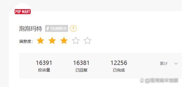截至5月14日,在黑貓投訴平台上,泡泡瑪特有16391條投訴量,已完成12256條,近30天有430條投訴量,已完成41條,投訴完成率僅為十分之一。