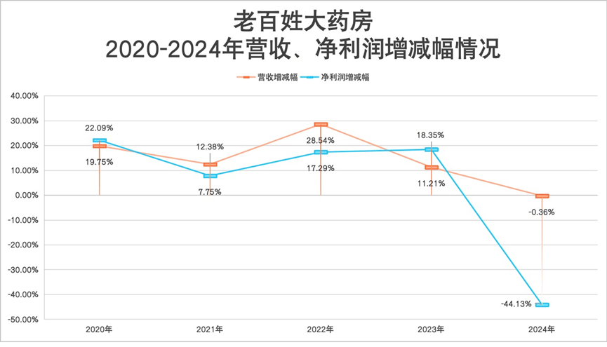 梳理上市連鎖藥店TOP6的財報可以看到,2024年,大參林、益豐藥房、老百姓、一心堂、漱玉平民、健之佳的營收基本呈個位數增長,除一心堂外的5家連鎖藥店營收增速均較上年收縮;淨利潤則除了益豐藥房略增8%之外,其餘均呈20%-240%不等的同比下滑。其中,老百姓大藥房這樣坐擁200億規模的行業龍頭企業,在2024年營收、淨利潤出現了“雙降”。