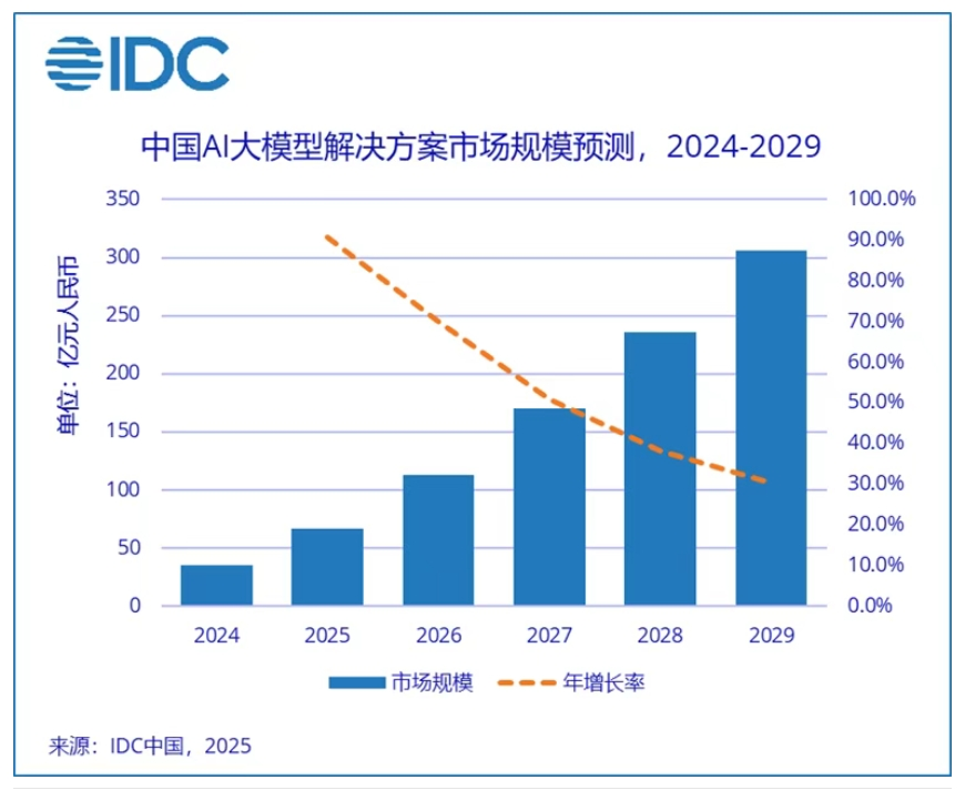 根據天眼查公開數據,及國際數據公司(IDC)最新發布的研究報告顯示,2024-2029年中國模型即服務(MaaS)市場將以66.1%的年均複合增長率高速擴容,預計2029年市場規模將達到90億元人民幣。AI大模型解決方案市場同樣保持高位增長態勢,預計2029年整體規模達306億元人民幣。