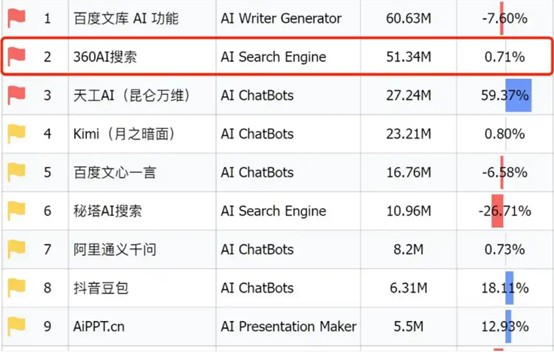 從業務佈局來看,360在AI和安全業務方面有着一定的基礎和潛力。在AI領域,360旗下的360AI搜索用户訪問量位列國內總榜第二名,跑贏Kimi和文心一言,成為全球AI搜索引擎產品三強,僅次於微軟New Bing與Perplexity.ai,持續領跑國內AI搜索引擎市場。全新升級的360AI瀏覽器頗受用户歡迎,用户日均使用時長超過5個小時,成為360產品新的增長點。這些成績表明,360在AI領域的技術實力和市場影響力正在逐步提升。