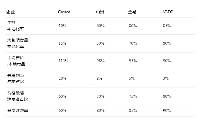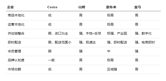 相比之下,Costco在供應鏈本地化、商品多樣性、自有品牌開發、會員服務、數字化能力和門店佈局等方面均存在明顯短板。