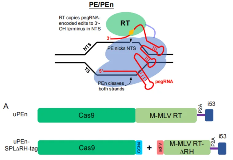 2019年,哈佛大學David Liu團隊開發的先導編輯(Prime Editing, PE)技術,徹底改變了傳統CRISPR-Cas9依賴DNA雙鏈斷裂(DSB)的編輯模式。PE通過融合Cas9單鏈切口酶(nickase)和逆轉錄酶(RT),實現了基因組"搜索-替換"式的精準操作,不僅大幅降低脱靶風險,還拓展了編輯範圍: