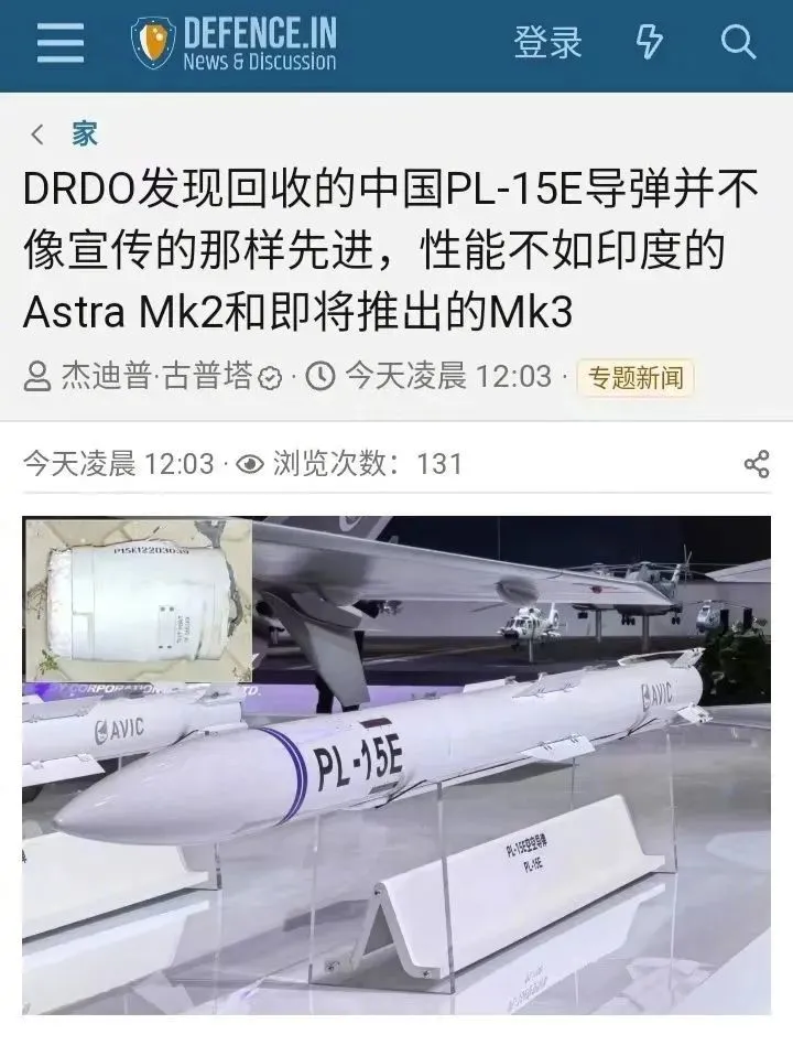 印度官員稱中國霹靂-15E值得複製的技術有限,而印度目前正在開發的國產“阿斯特拉”(Astra)mk2和mk3導彈在性能、射程和技術特性方面都明顯優於中國霹靂-15E導彈。(説明一下:mk2導彈還沒裝備,mk3導彈還在PPT上,還沒有研製)