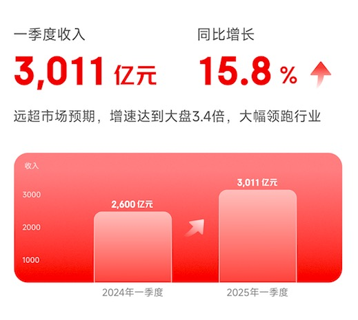 5月13日,京東披露2025年一季度業績,第一季度收入達到3011億元,同比增長15.8%,創下三年來最高同比增速的成績,超出同期大盤增速3.4倍,各項業務都實現了雙位數增長,可以説是碩果累累的一個季度。