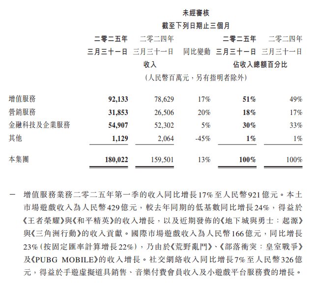 騰訊董事會主席兼首席執行官馬化騰表示,2025年第一季度騰訊的高質量收入保持堅實的增長態勢。“AI能力已經對效果廣告與長青遊戲等業務產生了實質性的貢獻。我們亦加大了對元寶應用與微信內的AI等新AI機遇的投入。我們相信,在AI戰略投入階段,現有高質量收入帶來的經營槓桿,將有助於消化這些AI相關投入產生的額外成本,保持財務穩健。我們預期,這些戰略性的AI投入將為用户與社會創造價值,併為我們產生長期、可觀的增量回報。”
