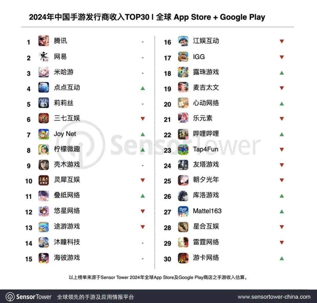 據遊戲工委公佈的數據顯示,今年第一季度中國自主研發遊戲海外市場實際銷售收入達48.05億美元,同比增長17.92%,來自海外市場的收入已經成為中國遊戲廠商的重要組成部分,包括騰訊在內的遊戲廠商已經成為全球遊戲市場的重要參與者。根據Sensor Tower的統計,2024年TOP30中國手遊發行商的收入佔全球TOP100手遊發行商收入的36%,其中騰訊為中國手遊發行商全球收入榜第一位。