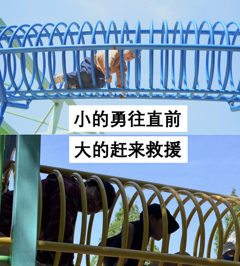 遊樂場有個設施,需要小朋友從空中隧道爬到盡頭後跳下來,植樹爬過去後發現他根本跳不下來,而那沒有回頭路!於是,我,30多歲身高四捨五入兩米的父親,去爬兒童隧道,救娃。