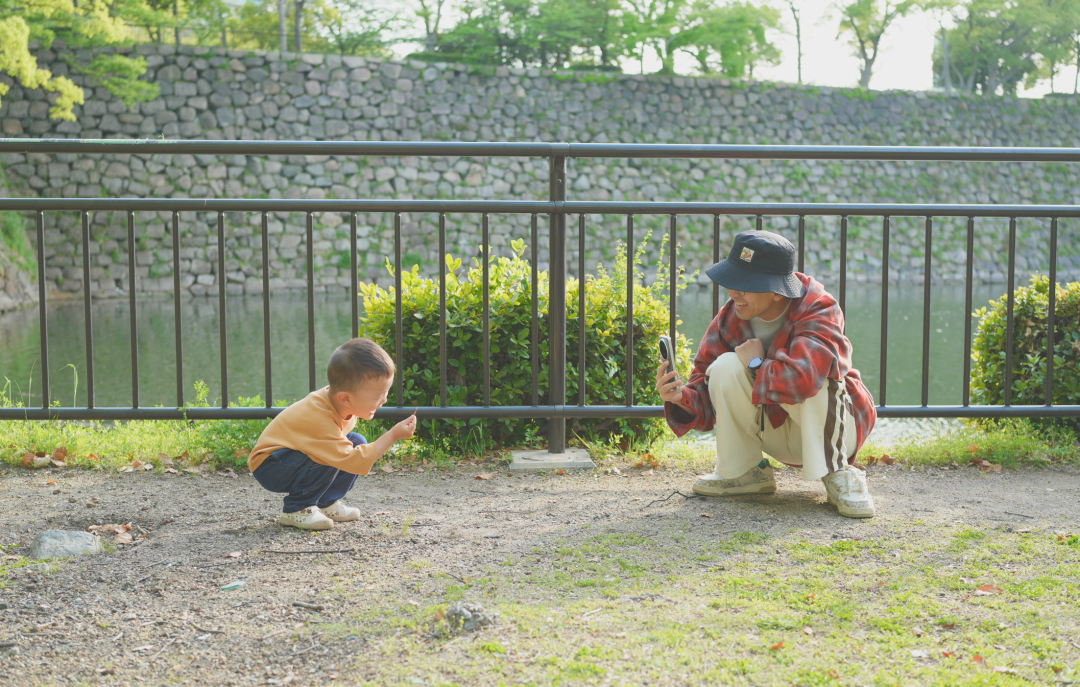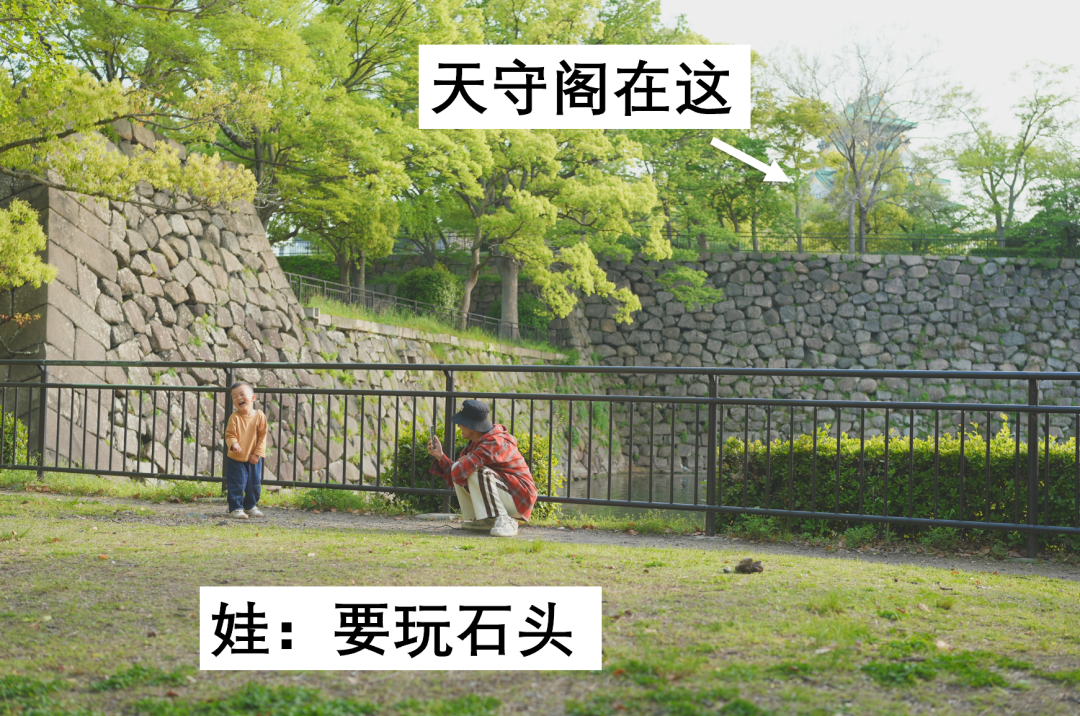 遊樂場玩完了終於快走到天守閣,植樹又到旁邊一片空地那玩石頭,找到一個石頭就哈哈大笑,算是那天最快樂的時光了!